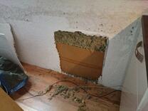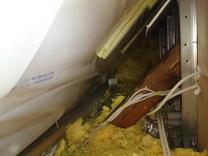 Hinter der Abseite war nur ungenügend Dämmung verlegt und Wasser- bzw. Heizungsrohre lagen frei. Wir verfüllten den Drempel mit Steinwolleflocken.