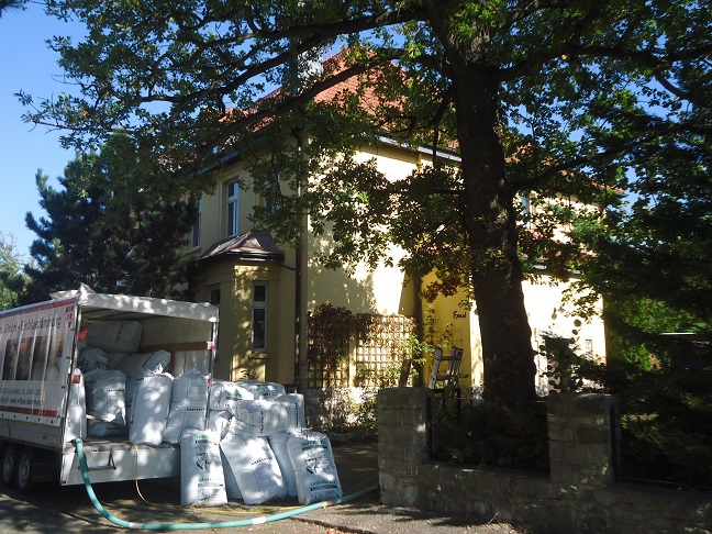 Die Hohlwände des 1.OG dieses Einfamilienhauses wurden mit Polystyrol-Granulat verfüllt. Dies führt dort zur Verbesserung des Raumklimas und zur Verringerung der Heizkosten.