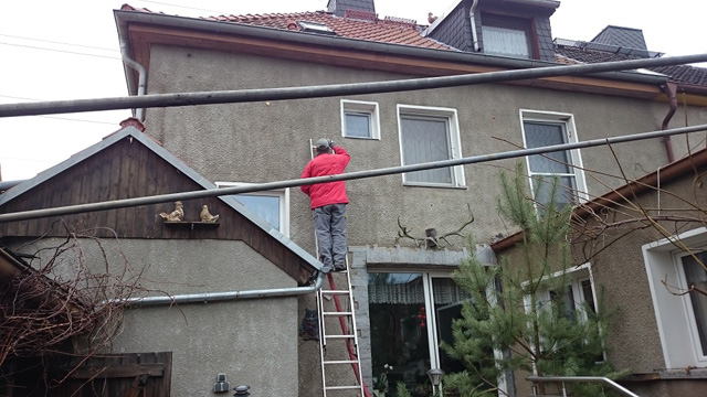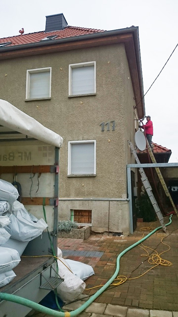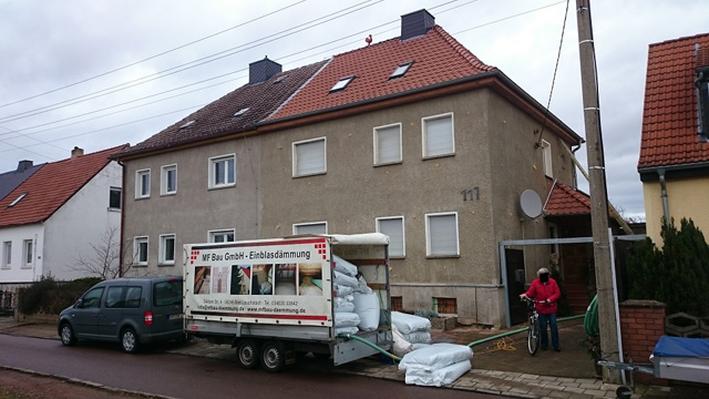 Die Doppelhaushälfte in Törten hatte ein zweischaliges Mauerwerk. Wir verfüllten es innerhalb eines Tages mit Polystyrol-Granulat mit einer Wärmeleitfähigkeit von 0,033 W/mK.
