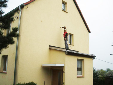 Die Hohlwand dieses zweigeschossigen Hauses wurde mit unserer mineralischen Kerndämmung vollständig verfüllt. Die Arbeiten waren nachmittags abgeschlossen.